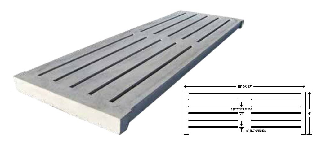 Concrete cattle gang slats are a larger, thicker version of our hog slats, designed for use in dairies and other cattle feeding or livestock barn installations.